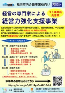 令和6年度 福岡市 介護事業所 経営力強化事業 令和6年度は、支援を希望される福岡市内の介護事業所を対象に、専門家を年度末までに無料で10回派遣 先着順30事業所となります。 専門家が日常の課題解決に向け実状に応じた支援を行います。 例えば […]