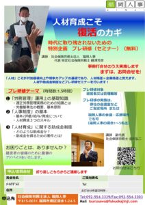 「人材」こそが付加価値向上や競争⼒アップの基礎であり、人材格差=企業格差 人材や助成⾦制度などプレ研修セミナーを⾏います︕ 事前打合せのうえ実施します! まずは、お問合せを。 プレ研修テーマ(時間数:1.5時間) ❶「労務管 […]